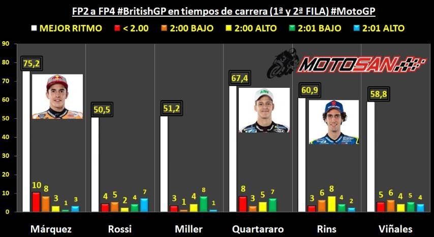 A esta pelea por el cajón añadiría a dos nombres, por galones y por experiencia personal en estos análisis. Por un lado Valentino Rossi, saliendo en primera fila siempre hay que contar con él. Más aún cuando es domingo y en carrera sabe hacer «milagros» como nadie. En el dato teórico le ha perjudicado dar esas 7 vueltas en 2:01 alto, pero una vez metido en batalla, tiene armas para llegar lejos.