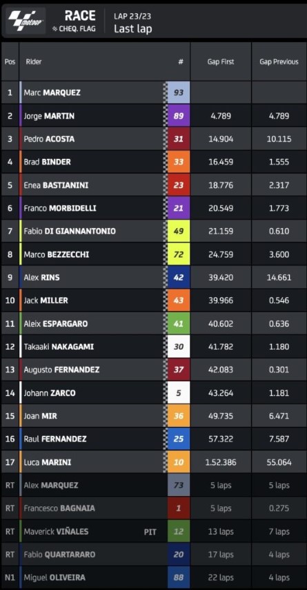 Alex Márquez se iba largo, ocasión que aprovechaba Pecco Bagnaia para pasarle por fuera. Sin embargo, el de Gresini chocaba con la Ducati, sufriendo los dos una aparatosa caída. La moto del Gresini quedaba sobre Bagnaia mientras los dos eran arrastrados por la grava. Afortunadamente, ambos pilotos podían levantarse por su propio pie. Era, por tanto, Pedro Acosta quien subía al podio tras Marc Márquez y Martín.