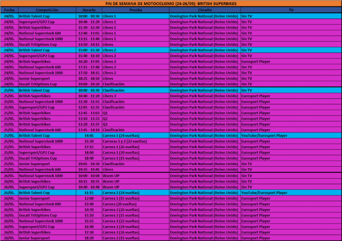 Contando con todas estas categorías, el horario de los tres días de competición resulta bastante extenso. El del viernes, con los primeros libres para todas las categorías, se alargará desde las 10 de la mañana hasta las 19:20 de la tarde. Los FP de la categoría reina serán a las 11:30 y a las 16:20. El sábado, se correrá desde las 10 hasta las 19:40. Las citas claves serán la clasificación (12:45 – 13:37) y la primera carrera del BSB (17:15), y más mangas del resto de categorías, a partir de las 14:45. El domingo, tras los Warm UP (10:00), se correrán hasta 9 carreras, con el BSB a las 14:30 y a las 17:30 como plato fuerte. La mayor parte de la acción en pista podrá seguirse en directo en Eurosport Player.