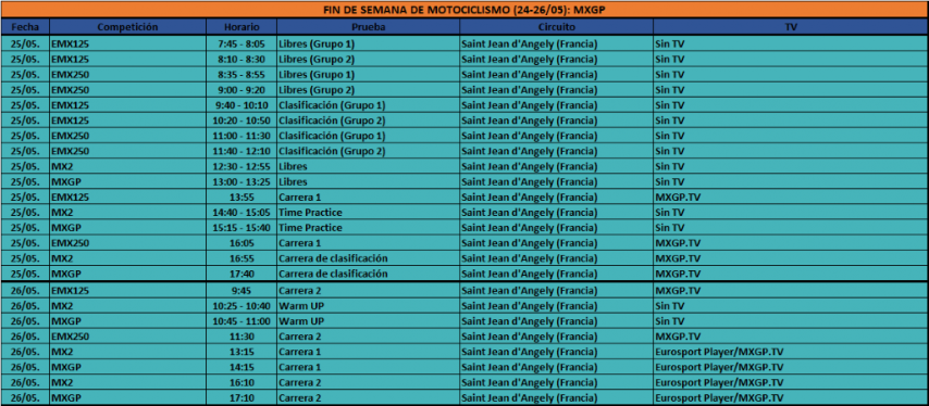 La acción en pista arrancará el sábado, con los entrenamientos libres, los Time Practice, las clasificaciones y las carreras de clasificación para ambas categorías. El domingo tendrán lugar las 4 carreras, a las horas habituales en territorio europeo (13:15, 14:15, 16:10 y 17:10). Los Campeonatos de Europa de 125 y 250 harán de categorías soporte a MX2 y MXGP en esta ocasión. Eurosport Player y la web oficial del campeonato retransmitirán las carreras.