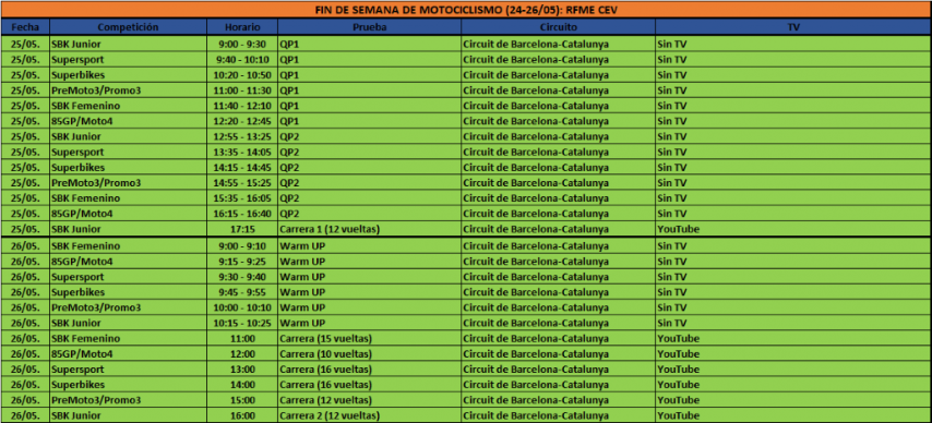 El sábado será día de clasificaciones a partir de las 9 de la mañana, con dos tandas para cada categoría, y la primera carrera, de SBK Junior, a las 17:15. El domingo, tras los Warm UP, será el turno de las carreras, con una cada hora entre las 11 y las 4 de la tarde. Todas las mangas podrán seguirse en directo en el canal de YouTube de la Real Federación Motociclista Española.