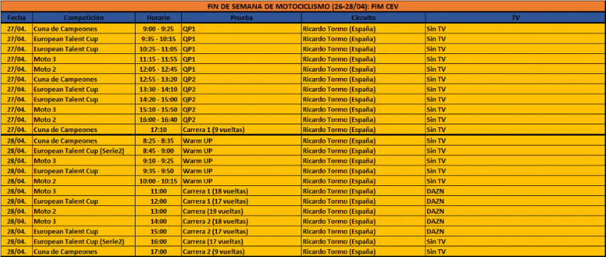 Así pues, este fin de semana tendremos dos carreras de Moto 3, una de Moto 2 y otras dos de la ETC, además de una doble manga de la Cuna de Campeones. El sábado tendrán lugar los entrenamientos oficiales, con la QP1 desde las 9 de la mañana y la QP2 desde las 12:55 del mediodía, y la primera carrera de la Cuna, a las 17:10 de la tarde. El domingo, tras los Warm UP, desde las 8:25, será el turno de las carreras, a partir de las 11 de la mañana, con una cada hora. Las 5 mangas principales podrán seguirse en directo en DAZN.
