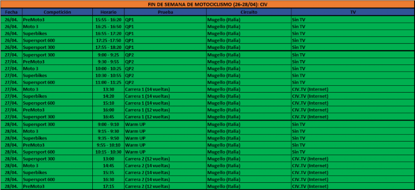 Este fin de semana, en Mugello, como viene siendo habitual, también habrá una doble manga para cada categoría. Las clasificaciones serán de dos sesiones, las primeras el viernes desde las 15:55 y las segundas el sábado desde las 9:00. Las primeras carreras acontecerán a partir de las 13:30 ese mismo sábado, mientras que el domingo tendrán lugar las mangas definitivas, a partir de la una de la tarde. Desde España, toda la acción podrá seguirse en la web del campeonato, www.civ.tv.