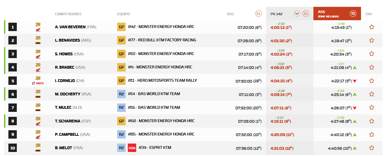 Con la décima etapa ya terminada, podíamos ver, como bien hemos comentado previamente, bastantes cambios en la clasificación general. De momento, Benavides lidera con una ventaja de 41:36:09 con las bonificaciones ya incluidas. Pero eso sí, no debía perder la concentración porque el de Honda le sigue muy de cerca con un tiempo de 41:36:50.