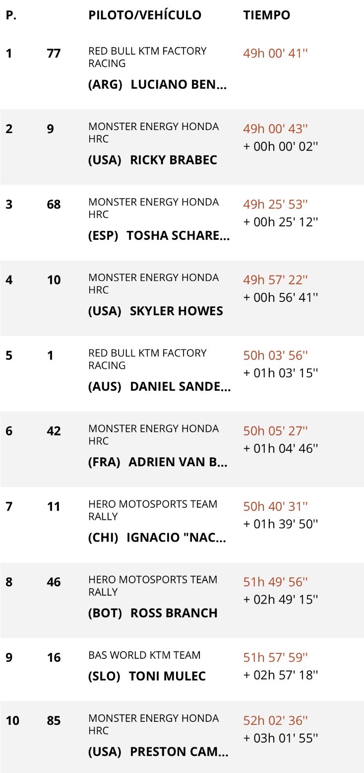 Cuando ambos pilotos cruzaron la meta, nadie daba crédito. Luciano Benavides se había proclamado campeón del Rally Dakar 2026 por solo dos segundos. Dos segundos que separaron la gloria del desierto del golpe más cruel que puede ofrecer esta carrera. Brabec, que en el último waypoint aún tenía +3:42 a su favor, vio cómo el Dakar se le escapaba en el último suspiro.