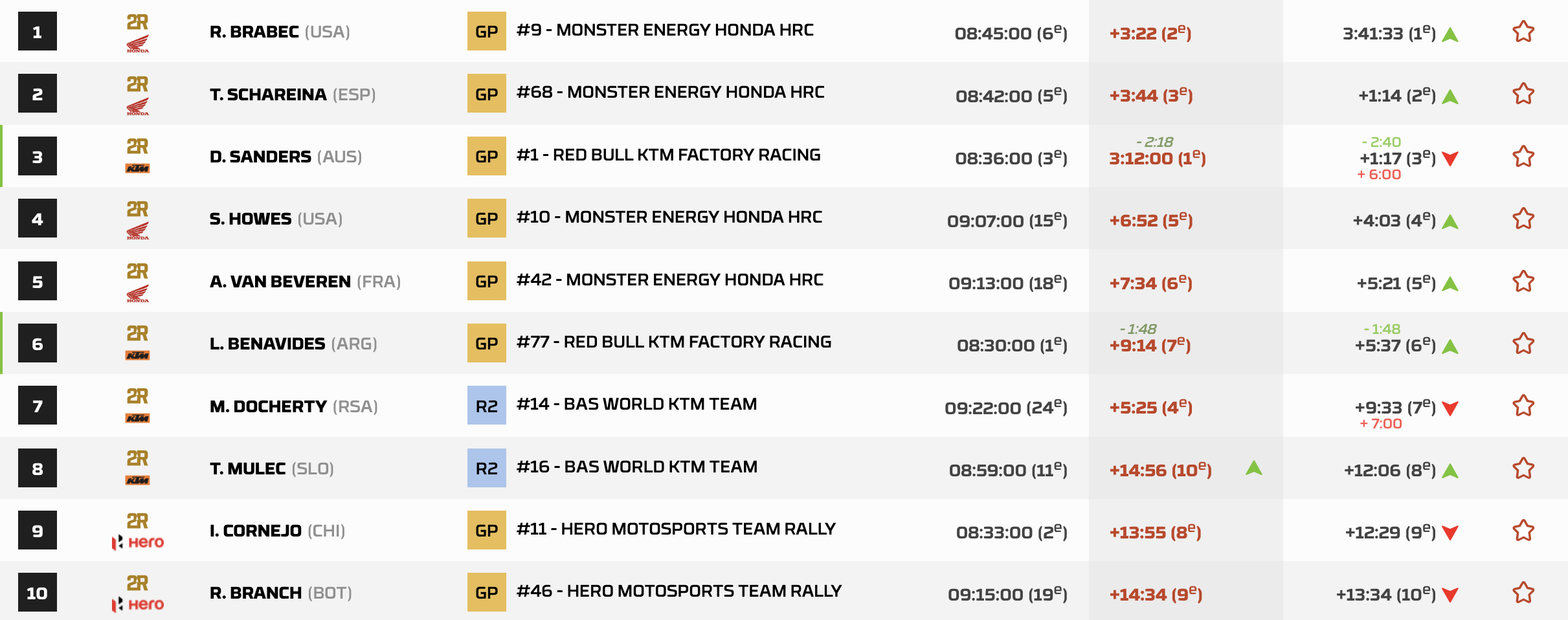 Poco después, Michael Docherty, piloto del Rally 2, sorprendió a todos al situarse en lo más alto de la clasificación FIM. Tras salir en la 24ª posición, el piloto de KTM del equipo BAS superó incluso a Sanders (+9”), mientras Brabec (+13”), Adrien Van Beveren (+30”) y Tosha Schareina (+33”) mantenían el ritmo. Aun así, la actuación de Sanders continuaba siendo la referencia entre los candidatos a la victoria final.