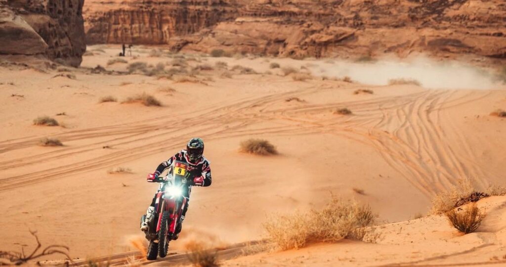Desde el primer tramo, Sanders dejó claro que venía a marcar la pauta. En el km 38 registró el mejor tiempo provisional, por delante de las Honda oficiales de Ricky Brabec (+4”) y Tosha Schareina (+24”). Su velocidad y precisión en la arena mostraban que estaba decidido a tomar el control de la etapa y sumar segundos importantes en la general.