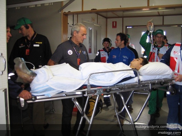 - Ya en MotoGP, todo iba encaminado y en la lucha por el título en su año de «rookie», pero en Sepang ’06 cae y sufre una fractura en el dedo pulgar del pie izquierdo y pérdida de sustancia cutánea en la rodilla derecha. Nada más que 5 puntos de sutura en ese corte vertical. Corrió e hizo podio.