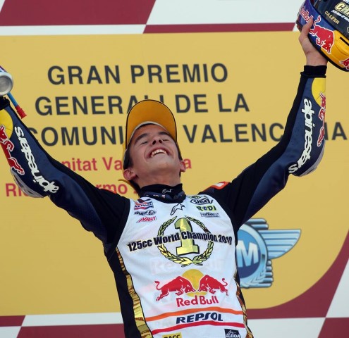 Su primer campeonato en el Mundial fue en el año 2010, en la categoría de 125 cc. Este logro lo consiguió en su tercera temporada en este certamen tras una constante progresión. Ese año se enfrentó a otros dos campeones como Nico Terol y Pol Espargaró, y consiguió diez victorias y dos terceros puestos. Aquel año Valencia decidió quién fue el campeón y una de las carreras para recordar fue sin duda la de Estoril, en la que Márquez se cayó en la vuelta de formación de parrilla, tuvo que salir en última posición y terminó ganando.