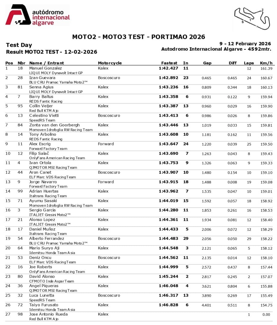 Los entrenamientos de pretemporada de Moto2 en el circuito de Portimão (Portugal) terminaron con un resultado inesperado: Manuel González se impuso en una jornada que estuvo lejos de ser normal, marcada por condiciones complicadas en pista y situaciones que alteraron la preparación de los equipos.