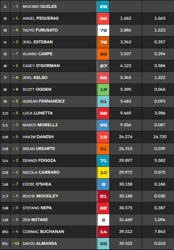 Las últimas cinco vueltas comenzaban con Quiles manteniendo la primera posición por delante de Furusato y Fernández. Kelso, por su parte, ocupaba la cuarta posición por delante de Piqueras y Carpe. Esteban por su parte, se lanzaba a adelantar a Piqueras y Carpe en una única maniobra, haciéndose con la quita posición. Al mismo tiempo, Guido Pini se iba al suelo.