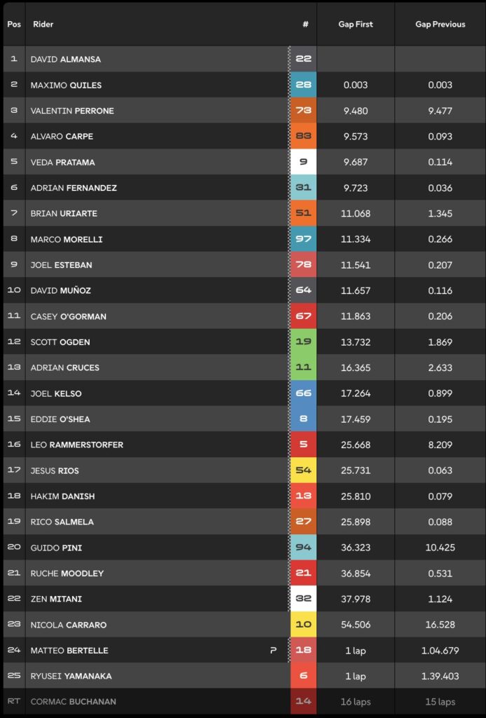 En su intento de hacerse con la primera posición, Quiles se iba largo. Sin embargo, el piloto del Aspar Team se recuperaba para pelear la victoria hasta la última curva. Aún así, David Almansa se hacía con la victoria por apenas tres milésimas, liderando desde la pole. Finalmente, era Perrone quien completaba el podio, con Carpe en la cuarta posición. Pratama cerraba el Top5; mientras que Fernández tenía que conformarse con la sexta posición.