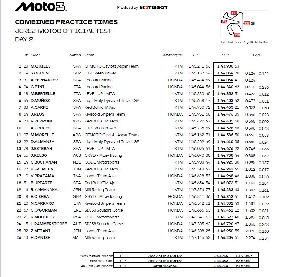 El Circuito de Jerez-Ángel Nieto ha acogido este fin de semana los entrenamientos oficiales de Moto3 y mañana y el martes entrenarán los pilotos de la categoría intermedia, de Moto2. De estos dos días en el sur de la península, el nombre que más ha destacado ha sido el de Máximo Quiles, que ha registrado el mejor tiempo, quedándose a dos décimas del récord de Alonso, finalizando por delante de Ogden y Adrián Fernández.