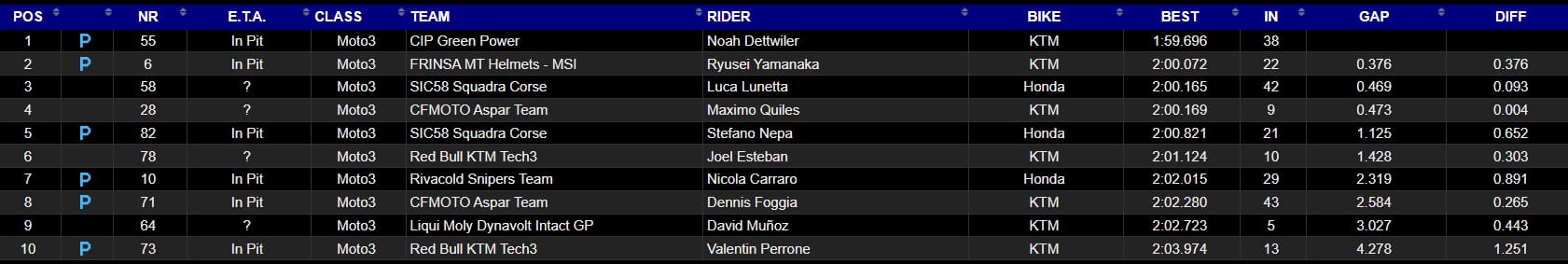Quien también se ha atrevido a salir a la pista ha sido Ryusei Yamanaka, superando ya los dos minutos en su vuelta más rápida. Luca Lunetta, por su parte, cerraba el Top3 de la jornada, con un registro de 2:00.165; casi medio segundo más lento que Dettwiler. Máximo Quiles y Stefano Nepa han ocupado la cuarta y quinta posición respectivamente; mientras que Joel Esteban ha sido sexto a casi un segundo y medio del líder.