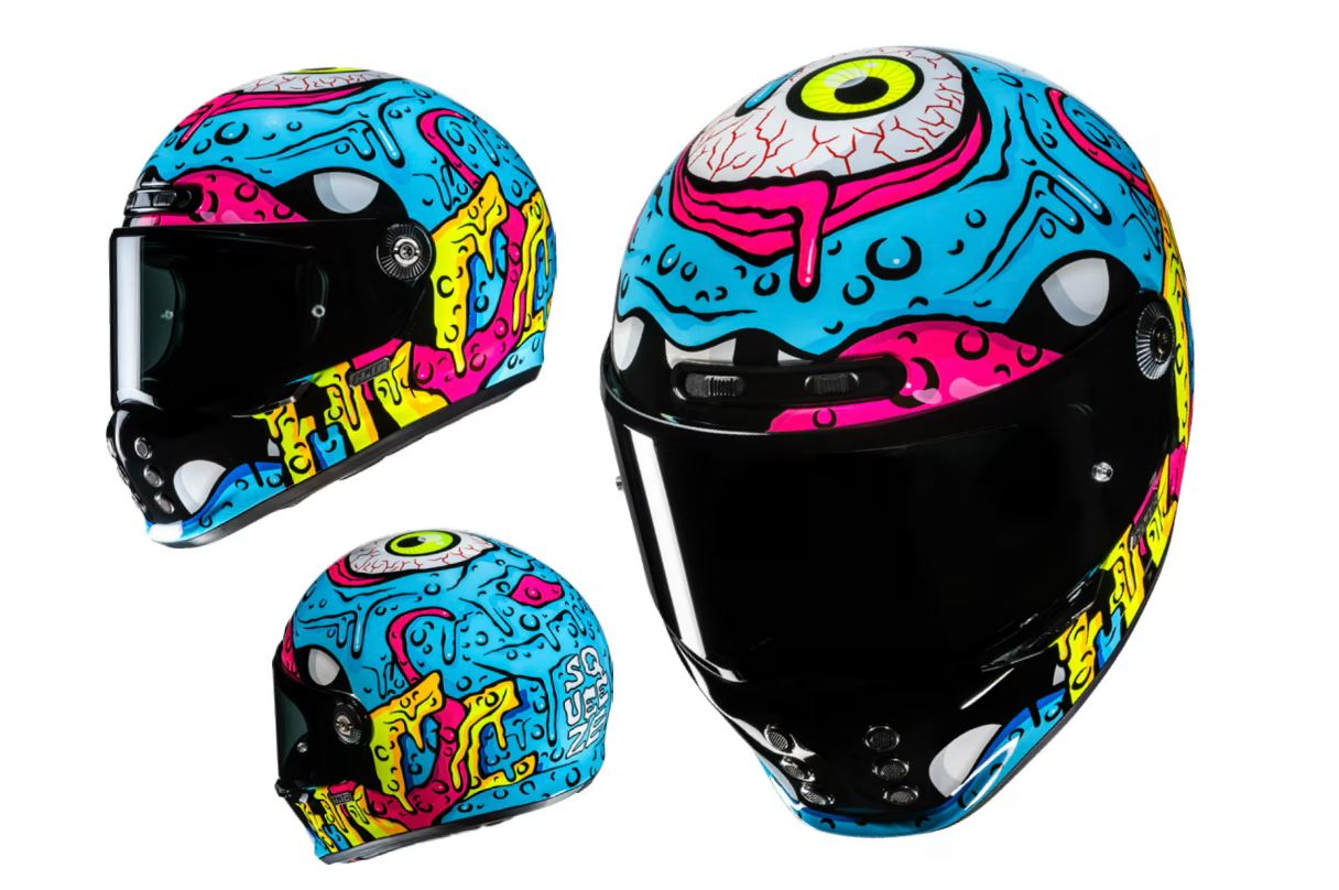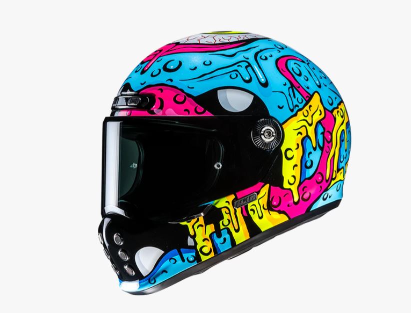 La gráfica del HJC V10 SQUEEZE estalla en una mezcla vibrante de color: amarillos neón, rosas intensos y azules eléctricos, combinados con una estética monstruosa que gotea y se derrite, como si hubiera salido directamente de una novela gráfica o del arte urbano más transgresor. Un enorme ojo inyectado en sangre corona la parte superior del casco, mientras los dientes y detalles viscosos envuelven la calota creando un look vivo, ruidoso, sin filtros e imposible de ignorar.