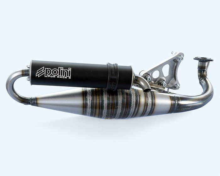 La expansión está fabricada con secciones de medidas diferenciadas, soldadas completamente a mano, lo que confirma el elevado nivel artesanal de Polini. El silenciador Black, actualizado tanto en el sistema de fijación como en los extremos, está construido en aleación ligera, con grabado láser, alma interna de escape directo y es completamente desmontable para sustituir el material fonoabsorbente.