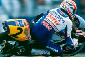 En el siguiente banco de trabajo, otro “aprendiz” con solo 40 años en su haber. De pie con la única pieza de equipo que necesita, un cuchillo de corte súper afilado, está rodeado por 100 plantillas de cartón y lo que parece una gran sierra de calar de cuero. Las piezas rojas, blancas y azules de diferentes tamaños están esparcidas por su escritorio. Le pregunto; “Este es un mono de carrera para Sam Lowes, ¿conoces al piloto británico de Moto2?” y él dice; «Sí, estoy familiarizado con su trabajo».