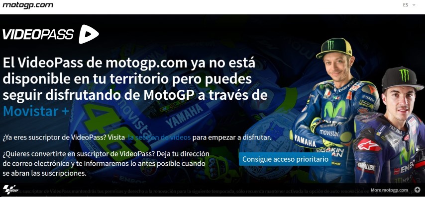 Antes teníamos la opción de «VideoPass» donde directamente conectabas con la web de motogp.com y por 139,99€ tenías acceso a la señal internacional con comentarios en inglés, pero esta mañana cuando conectas para intentar contratar… ¡Ya no está disponible! Sólo a través de MovistarTV.