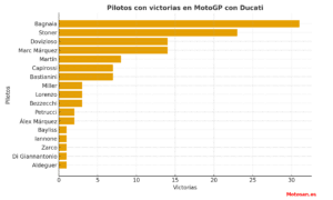 La llegada de Francesco Bagnaia en 2021 marcó el inicio de una nueva era. El turinés acumula ya 31 victorias, convirtiéndose en el piloto más exitoso con Ducati y en el referente absoluto de una generación que ha devuelto a la marca al lugar más alto del podio.