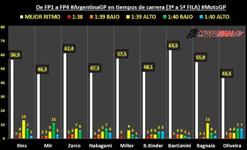Si observamos los pilotos que salen más atrás, encontramos a los pilotos que sobre el papel, pelearán el podio junto a Quartararo. Hablamos de Rins, Zarco, Miller o Bastianini, que tienen un ritmo de 1:39 alto pero que tendrán que remontar. Se esperaba más tal vez de Joan Mir, que sigue sin las mejores sensaciones y ha mostrado un ritmo en 1:40 bajo.
