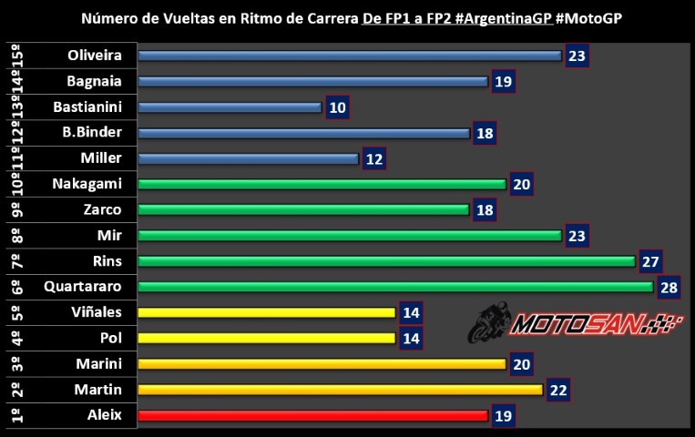 Comprobando el número de vueltas dadas en ritmo de carrera, nos encontramos con un habitual en lo más alto, Fabio Quartararo con Yamaha ha dado 28. Los pilotos de Suzuki, Rins y Mir, han dado 27 y 23 vueltas. En contra Bastianini y Miller han dado muy pocas vueltas en ritmo de carrera, con 10 y 12 respectivamente. El más rápido, Aleix Espargaró, dio 19.
