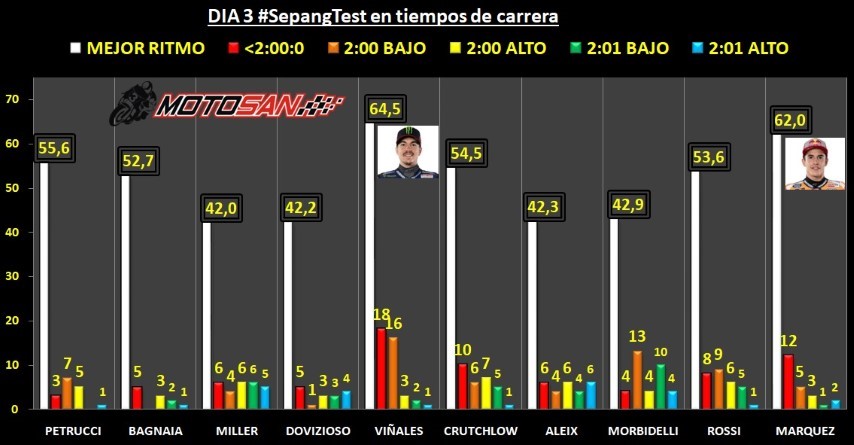 El mejor Maverick Viñales ha vuelto. Tras un 2018 donde anduvo perdido entre el optimismo de los jueves y la decepción del domingo, ha conseguido reinventarse. Ha regresado a ese 2017 cuando podía mantener un ritmo más fuerte que el resto para dominar cualquier entrenamiento. Salta a simple vista lo que ha hecho hoy viendo el gráfico: el de Roses ha dado 40 vueltas en ritmo de carrera, de las cuales 34 por debajo de los 2:00.500. Se va de Sepang como el más fuerte de global de los tres días sin lugar a dudas.