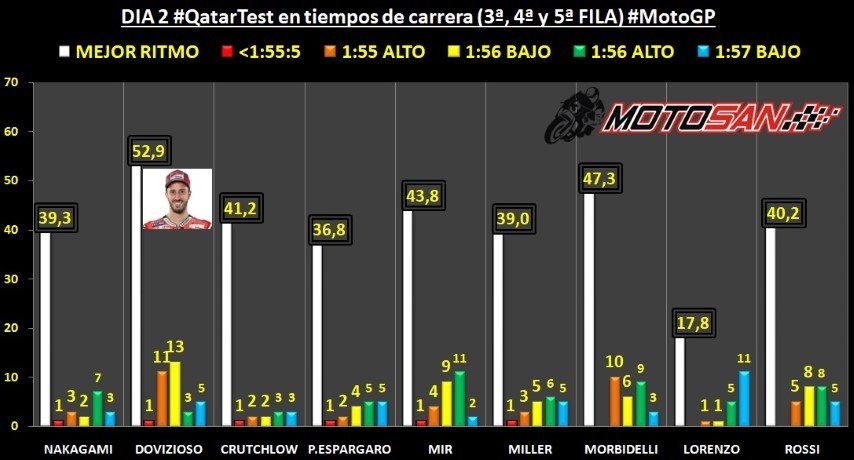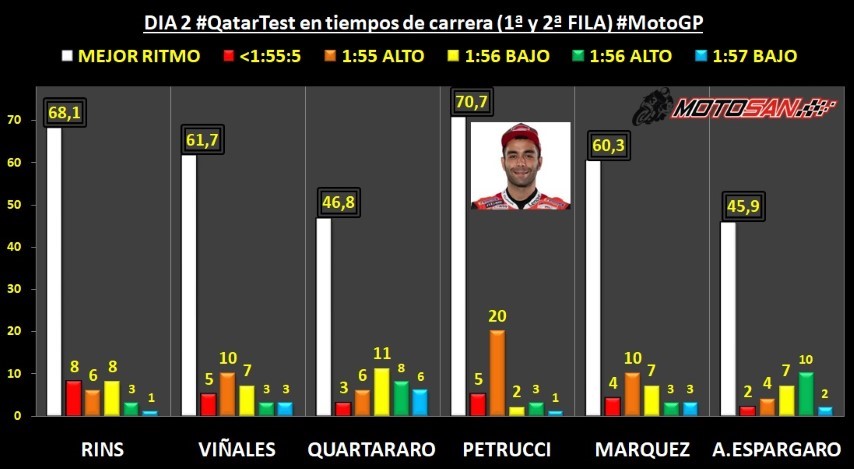 Vamos más allá. ¿Cuántas vueltas en ritmo de carrera han sido a una velocidad fuerte por debajo del 1:56.500? Así llegamos a los 5 pilotos destacados nombrados antes: Petrucci, Rins, Viñales, Márquez y Dovizioso. Si la carrera fuese mañana tendríamos una bonita lucha entre ellos, a los que personalmente uniría la figura de Valentino Rossi, que es el de momento el que más está escondiendo lo que puede llegar a hacer.