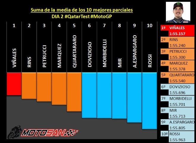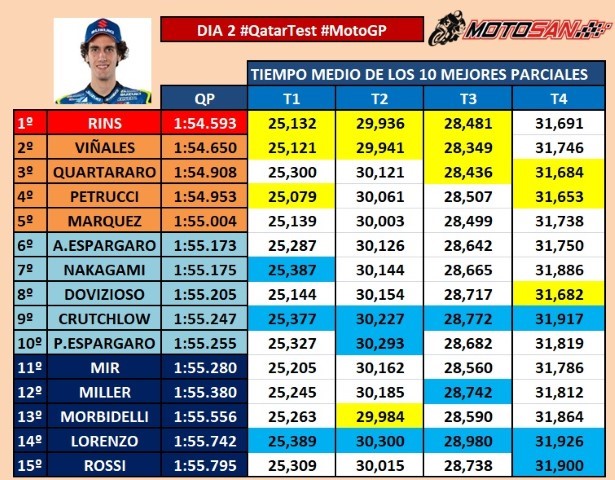 Segundo día de entrenamientos en Qatar y aunque se mantienen arriba los tres mismos protagonistas del primer día, Viñales, Rins y Petrucci, algunos de los favoritos empiezan a asomarse con un buen ritmo de carrera.