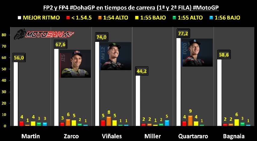 En una jornada de sábado marcada por el fuerte viene en el desierto de Doha, el FP3 no ha sido significativo, donde los pilotos más rápidos han rodado en 1:56, muy lejos de los 1:53 que hemos visto en la lucha por la pole. Por ese motivo en nuestro estudio de hoy sólo tomaremos de referencia el FP2 y el FP4, dos entrenamientos de noche bajo los focos, en un horario similar a la carrera de mañana.