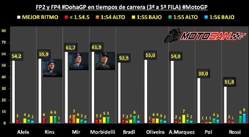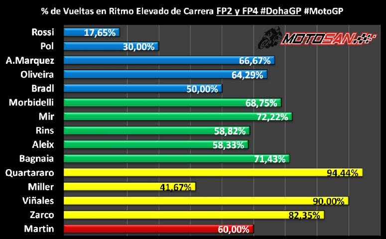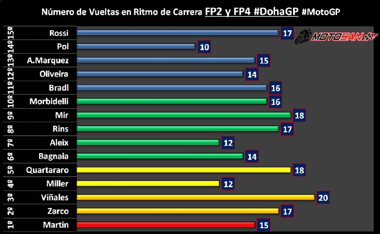 Viñales fue el piloto con más vueltas en ritmo de carrera (20). El resto de pilotos Yamaha también han estado arriba, aunque con menos diferencia sobre el resto de lo habitual: Quartararo (18), Rossi (17) y Morbidelli (16). Las Suzuki de Rins y Mir también han dado muchas vueltas buscando sensaciones para carrera. Por contra, Pol Espargaró (Honda) ha tenido un bajón importante este fin de semana.