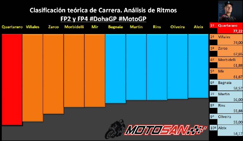 Y aquí tenemos el posible TOP 10 para la carrera de mañana. La igualdad es máxima entre Quartararo y Viñales. El ritmo lo tienen, así que la salida y las primeras vueltas mezcladas con las Ducati, pueden ser la clave de la diferencia entre ellos. Por parte de las motos italianas, Johann Zarco es el que presenta el mejor ritmo, optando al que sería su segundo podía de manera consecutiva en MotoGP.