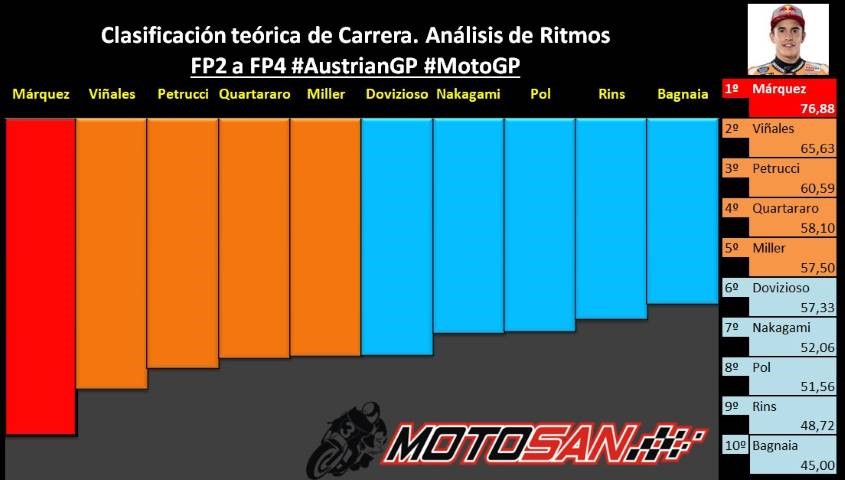 En el % de vueltas de ritmo de carrera en ritmo elevado, en este caso vueltas en 1:23 y 1:24, Marc Márquez confirma lo claro que lo tiene para mañana con un 93,75%. Viñales tiene un gran ritmo pero sale en cuarta fila y mañana se enfrentará por enésima vez a su cruz: siempre muy arriba en entrenamientos para después tener problemas en carrera. Para eso tendrá que superar varios retos: