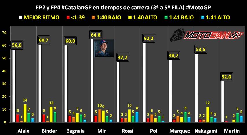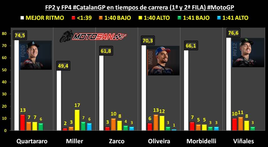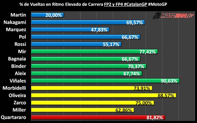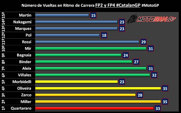 En lo referido a pilotos con más vueltas en ritmo de carrera, sorprende el registro de Jack Miller con Ducati (35 vueltas), pese a no marcar ritmos fuertes. Le iguala Oliveira (35), aunque el de KTM si ha mostrado ritmo para luchar por el podio. Tras ellos las clásicas Yamaha, Fabio Quartararo con 33 y Maverick Viñales con 32. Como de costumbre Pol Espargaró da muy pocas vueltas (18) y como era de esperar, un convaleciente de sus operaciones Martín sumó 15 vueltas.