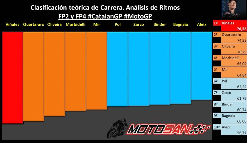 El análisis de ritmos confirma que si Viñales es capaz de hacer una buena salida, podría competir contra Quartararo por la victoria. La diferencia es que mientras el francés sale 1º en parrilla, el catalán sale en 6º lugar. Entre medias Oliveira, que podría aprovechar la potencia de su KTM para hacer una gran salida y confirmar el ritmo mostrado. Si esto fuera cierto, de nuevo nos quedaríamos sin Ducati en el podio. Morbidelli y Mir son los otros dos que podrían unirse a la fiesta de los podios.