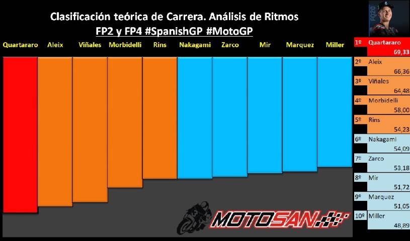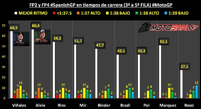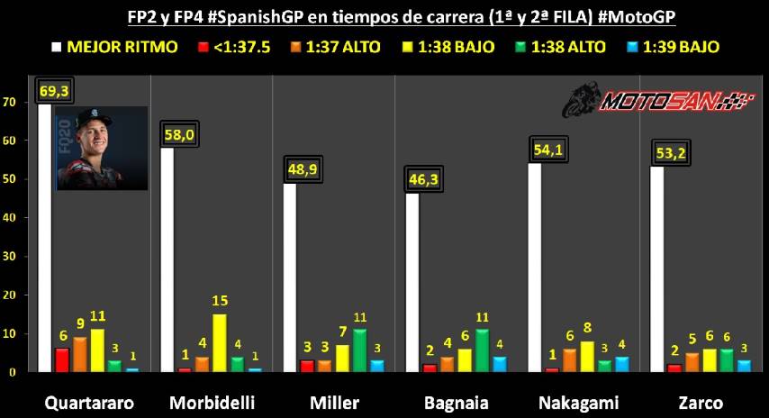 Yamaha es la moto correcta para ganar en Jerez y el % de vueltas en ritmo de carrera elevado (por debajo de 1:38.500) así lo confirma. Quartararo también encabeza este dato con el 86,67% de las vueltas. Más igualados Viñales (82,76%), Aleix Espargaró (81,82%) y Morbidelli (80%). En el lado negativo sorprenden los datos de Valentino Rossi, en un circuito tan favorable a su M1, está totalmente perdido en el que es sin duda el momento más bajo de su carrera deportiva.