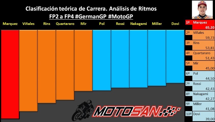 No sólo Marc Márquez ha dado más vueltas que nadie, 50, sino que el 84% de esas vueltas las ha dado por debajo del 1:22. No hay duda que tiene el mejor ritmo. Tras él, Viñales con el 75,68%, al que señala como el gran rival para mañana esta vez de forma más clara que en Assen. Como tercera opción Rins, con el 66,67% de sus vueltas en ritmo elevado de carrera. El de Suzuki tiene opciones de «sacarse» la espina de la caída en la anterior carrera cuando iba en cabeza. Quartararo aquí queda más lejos tras el ritmo más bajo mostrado en el FP4. Brillante Pol Espargaró, siempre el número 1 de KTM con claridad.