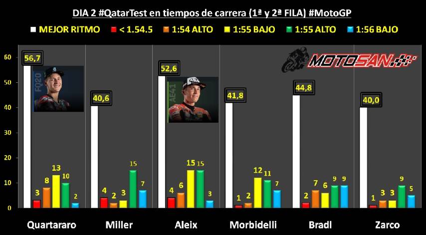 Si la carrera fuese mañana, tendríamos un TOP 5 bastante definido: Maverick Viñales y Fabio Quartararo, ambos oficiales en Yamaha y especialistas en ser muy rápidos en entrenamientos. Necesitarían pista libre en carrera, aunque la larga recta de Qatar jugaría en su contra. Sorprendente Aleix Espargaró, luchando por un podio que su marca, Aprilia, nunca ha conseguido en MotoGP.