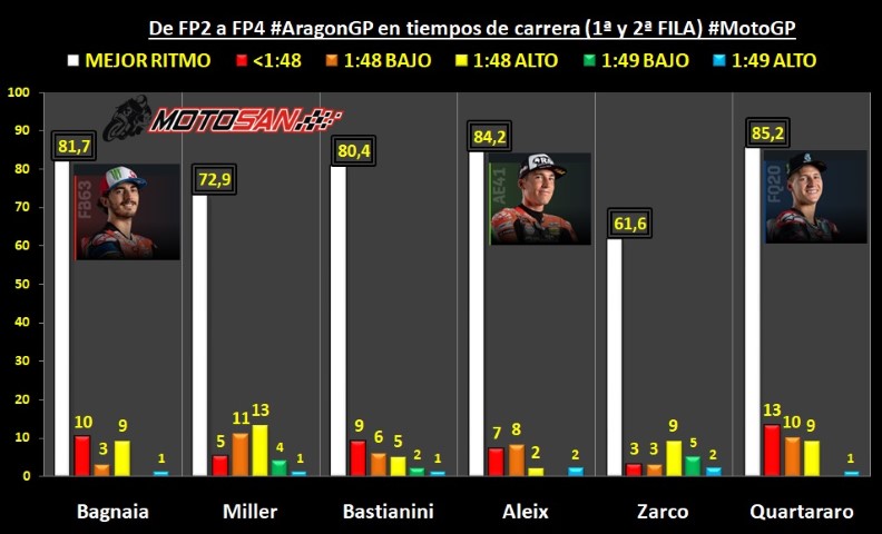 Bastianini también estará en la «pomada» con 9 vueltas en 1:47 y 11 en 1:48. Los otros dos contendientes al título también tienen un gran ritmo. Aleix tiene 7 vueltas en 1:47 y 8 en 1:48, mientras que Quartararo va aún más allá con 13 vueltas en 1:47 y 19 vueltas en 1:48. Su compatriota Zarco aunque se ha metido en segunda fila, no optará al podio.