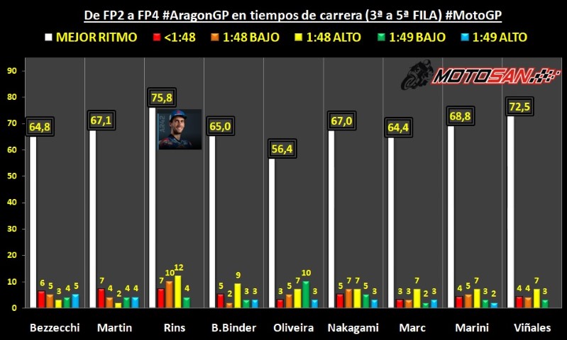 En lo referido a los pilotos que van de la tercera a la quinta fila, destacan por ritmo Álex Rins con 19 vueltas en 1:48. También Maverick Viñales, que hoy durante la Q1 ha sufrido su primera caída en este Mundial, saldrá muy atrás pero seguro que remontará posiciones para intentar llegar hasta el TOP 10.