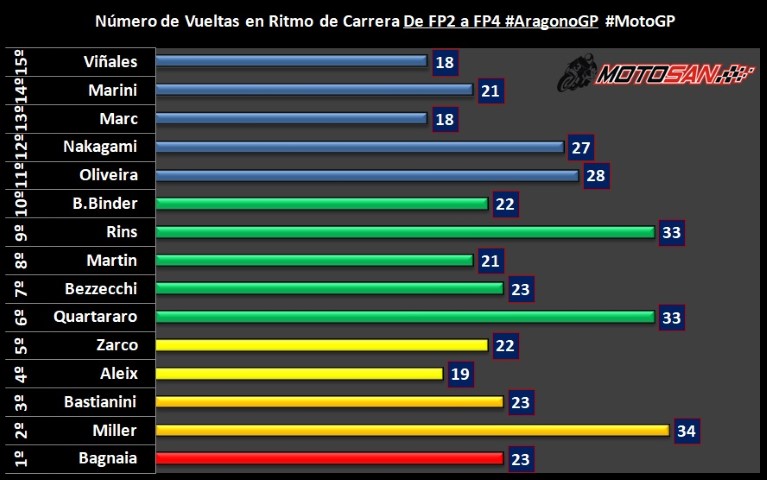 En contra llama la atención las pocas vueltas dadas por Aleix Espargaró, puede que las dos caídas sufridas durante el viernes le han influido en este dato. Por contra nos encontramos con Marc Márquez (Honda) con 18 vueltas, como el piloto dentro de este TOP 15 con menos vueltas en ritmo de carrera.