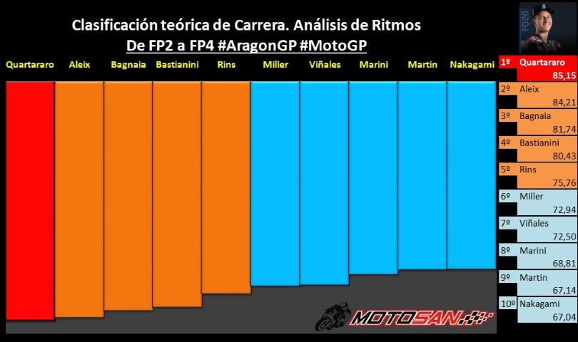 Sobre el papel, el ritmo de Quartararo (en un circuito que siempre se le ha dado mal), es el mejor de todos, aunque muy igualado nos encontramos a Aleix Espargaró, que se ha marcado en rojo este Gran Premio como zona de ataque para recuperar puntos.