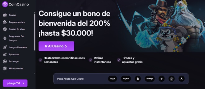 - Coin Casino – 200 % hasta $30.000 más 50 super giros
