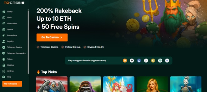 - TG.Casino – 200 % hasta 10 ETH más 50 giros gratis