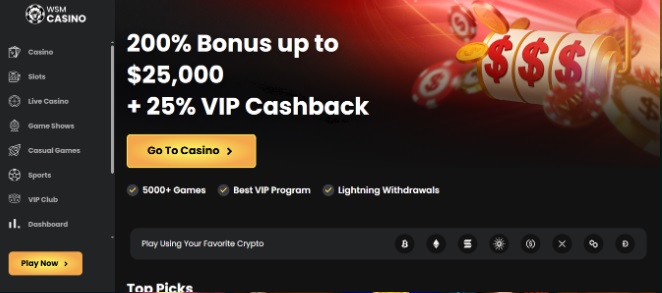 - WSM Casino – 200 % hasta $25.000 más 50 giros gratis