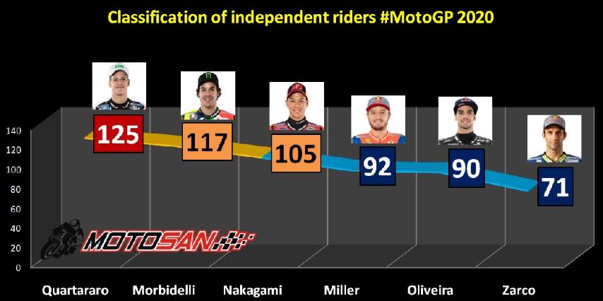 La clasificación de pilotos satélite sigue apretada. Nueva carrera nefasta para Fabio Quartararo, que desde su victoria en Cataluña no ha tenido más alegrías. Morbidelli se le acerca a 8 puntos, e incluso Nakagami podría optar al honor con Honda de ser el mejor piloto que no es oficial. Miller con 92, Oliveira que hoy fue TOP 5 con 90 y Zarco con 71, cierran esta clasificación con los seis mejores.