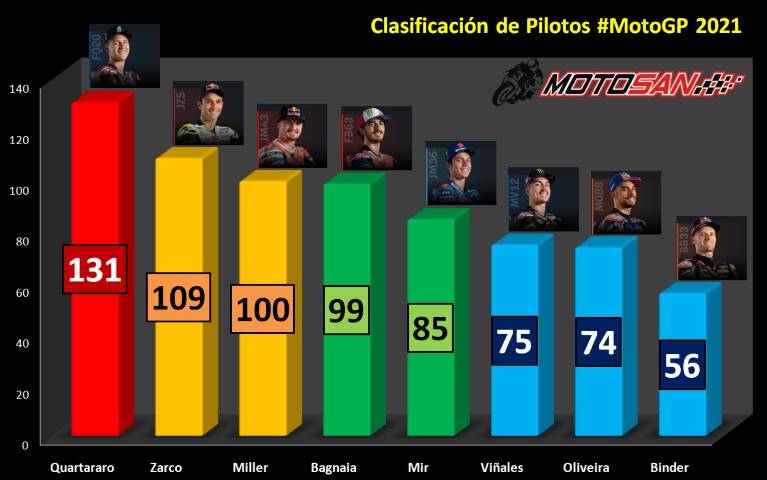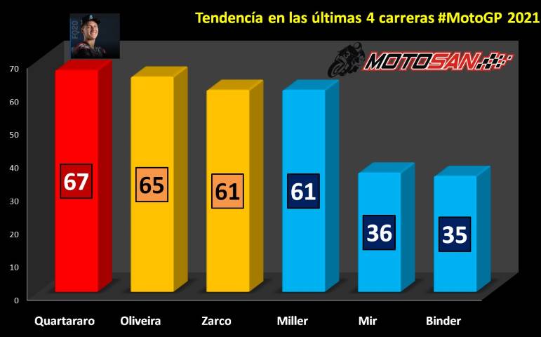 La tendencia de las últimas carrera está muy equilibrada, con Quartararo, Oliveira, Zarco y Miller en apenas seis puntos. El francés está corriendo en «modo campeón» para aguantar su liderato. Cuando puede gana y cuando no, sabe sumar puntos, algo que no supo hacer en 2020. Oliveira es quien más está subiendo últimamente con tres podios consecutivos, dos segundos y una victoria… ¡Ojo al de KTM que aún queda mucho Mundial!