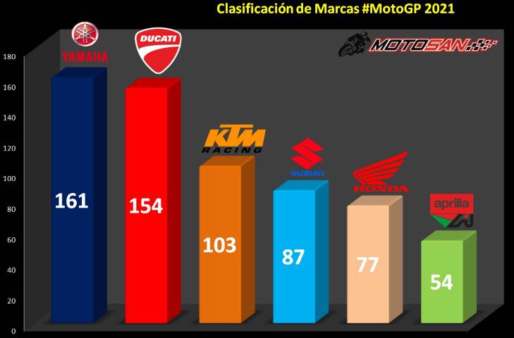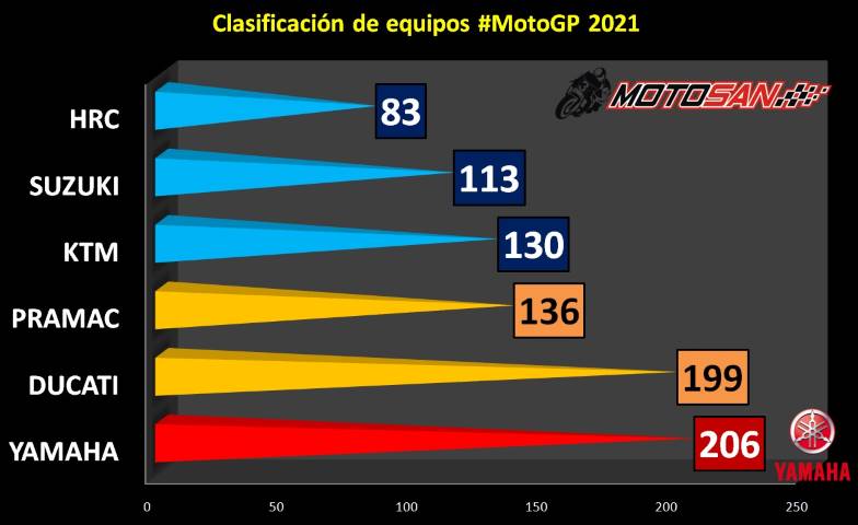 En la clasificación por equipos también sigue el «cara a cara» entre Yamaha y Ducati. En este caso Yamaha aumenta su ventaja en 5 puntos respecto a Ducati gracias al 3º de Quartararo y el 5º de Bagnaia. KTM se consolida como la tercera mejor marca gracias a los +20 de Oliveira. Por su parte Honda, en una clara crisis en la que incluso se hablaba de posibles concesiones técnicas para 2022, Marc Márquez ha vuelto a hacer su magia para ganar y sumar +25 puntos. Aprilia se queda atrás de nuevo como «farolillo rojo», pero es que prácticamente sólo tienen un piloto, Aleix Espargaró.