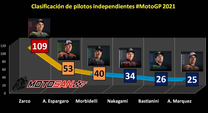 El año pasado fue la temporada de los pilotos satélites, pero este año es otra la película. Aleix Espargaró fue el mejor de esta clasificación hoy al acabar séptimo. El de Aprilia estaba en posición de podio cuando empezaron a caer unas gotas y perdió «grip». Zarco, segundo en el Mundial, hoy no ha tenido un buen día para sumar sólo 8 puntos. Morbidelli por su parte, una carrera para olvidar al acabar fuera de los puntos. Yamaha no está dando buen trato al actual subcampeón del mundo.