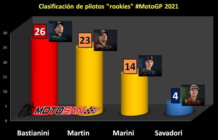 En la batalla de los «rookies» vuelve a sobresalir Jorge Martín. El español, aún en fase de recuperación tras las lesiones sufridas en Portimao que le obligaron a perderse varias carreras, clasificó muy bien y supo aguantar para acabar en 12º posición. Bastianini hoy no sumó puntos, Savadori se cayó y Luca Marini pudo ser 15º para salvar 1 punto.