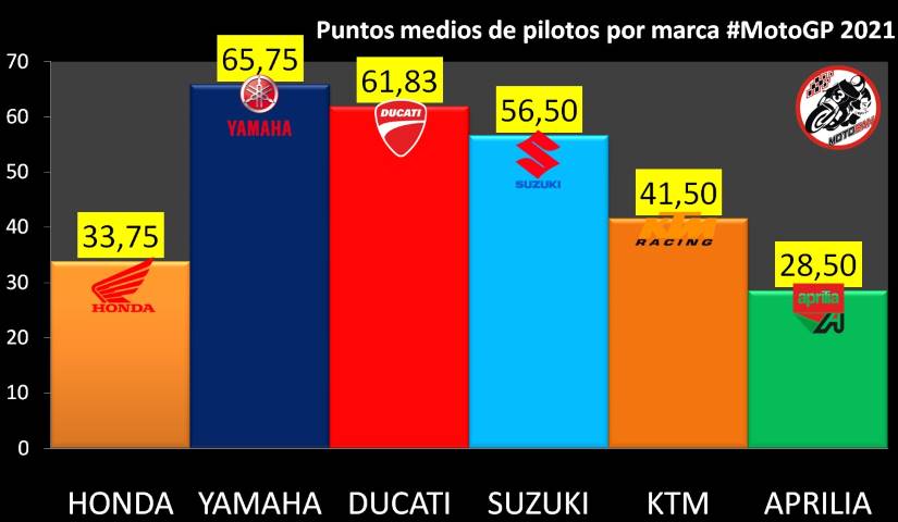 En lo referido a los puntos medios por marca, Yamaha sigue siendo la moto en la que sus pilotos suman más puntos medios, seguido de Ducati y Suzuki bastante cerca. KTM y Honda progresan un poco, aunque aún están lejos, mientras que Aprilia sigue siendo la moto con la que más difícil es sumar puntos.